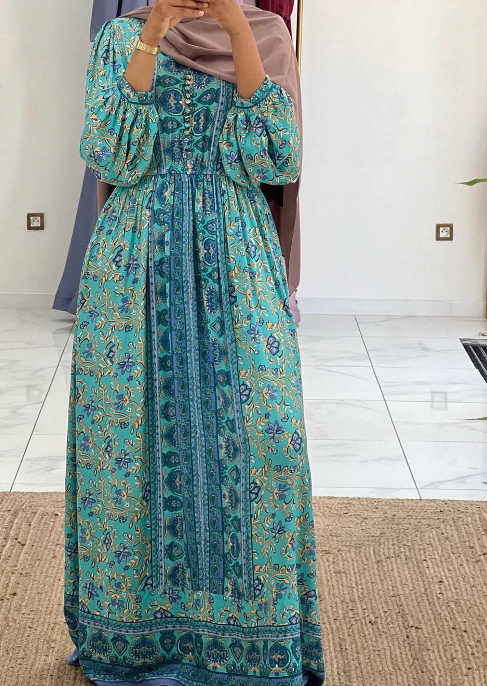 Deze prachtige lichte maxi jurk is van 100% viscose. Ideaal voor het warme weer. Aangeraden eigen maat te nemen.
