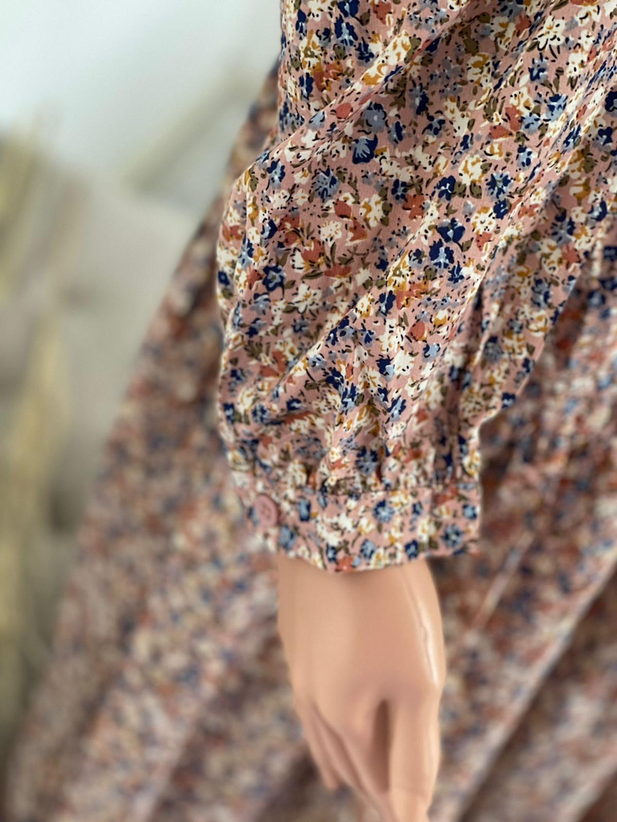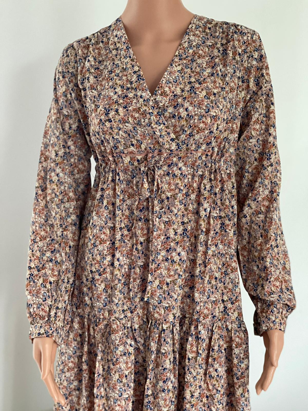 De jurk heeft ook een laagje schattige ruffles en heeft bloemetjespatronen in verschillende kleurtjes.