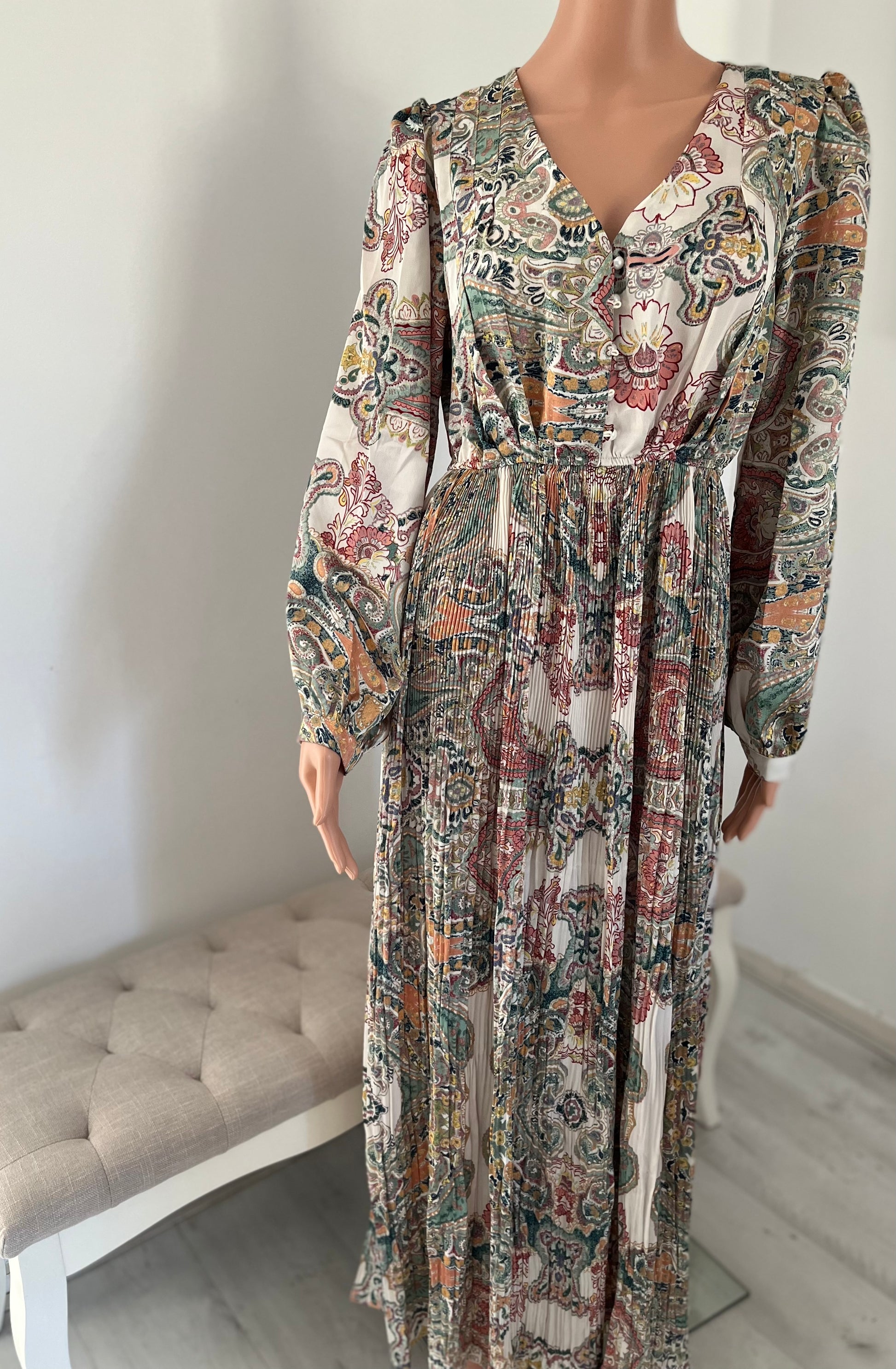 Deze lange satijnen jurk is echt een musthave. Jurk schijnt niet door, jurk heeft een elastische  band en knoopjes aan de bovenkant. Jurk heeft een plissé onderkant.